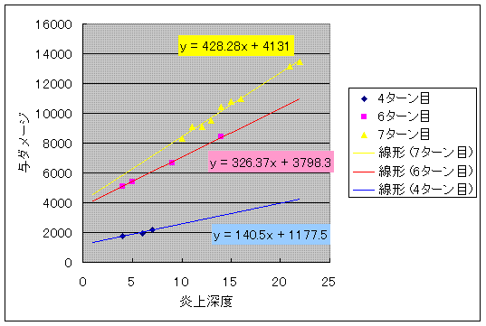 傾きが切片の10%程度なので、よく言われている「炎上深度(1)ごとに約10%ダメージアップ」であいます。