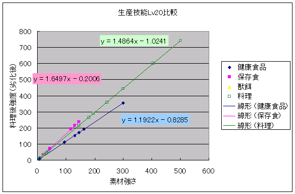 比較はあくまで同じ技能レベル 横軸は素材の強さ、縦軸は劣化する前の料理直後の値(計算値)